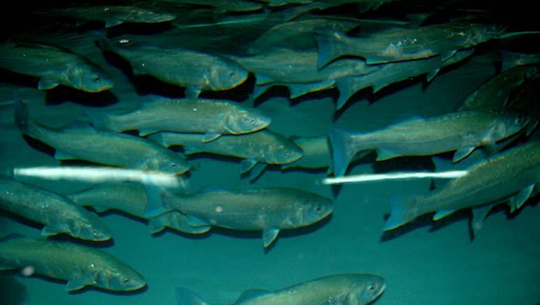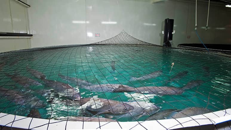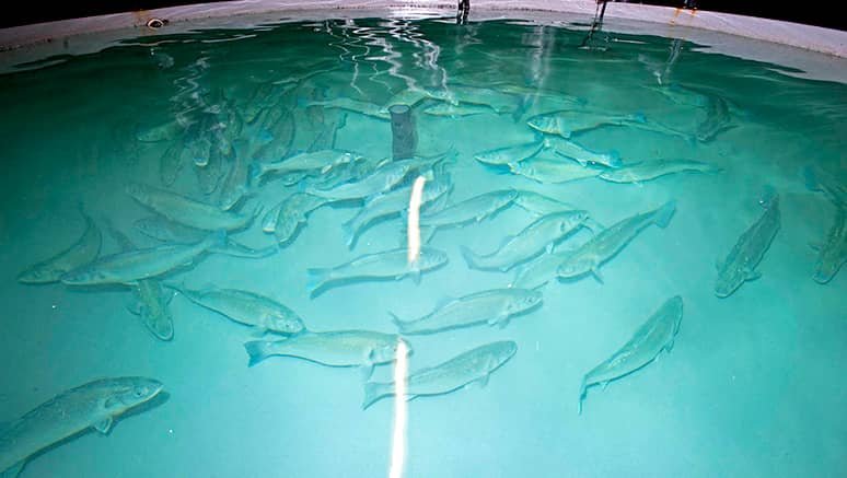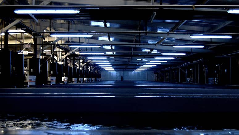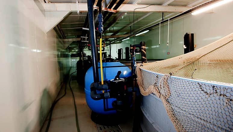 In the closed-cycle system 3% of the 4,000 m3 of water is changed each hour. This is possible thanks to the use of drum filters, protein skimmers, disinfection with ozone and ultraviolet light, and biological filters, which clean the water before it is recycled. The 3% of new water that enters the system is to compensate for the loss of water through evaporation or from the drum filter. The fish reared in this system are also primed for being introduced into the sea. When the fish are put into the sea cages, they are exposed to pathogens that are naturally present in the water. In the hatchery the water is subject to disinfection that reduces the level of these pathogens so that they cannot harm the fish, yet they do trigger the animals’ immune systems, so that when put into the sea the fish can cope with the pathogens they are exposed to without falling ill.